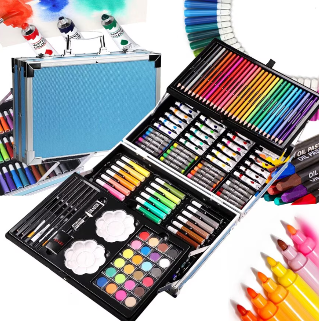 Set complet cu 145 de piese pentru desen și pictură, într-o cutie tip servietă ușor de transportat. Include creioane colorate, carioci, acuarele, pastele și accesorii.