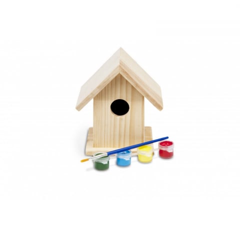 Căsuță de păsărele din lemn natural, gata de pictat. Include pensulă și 4 vopsele acrilice mini. Dim...