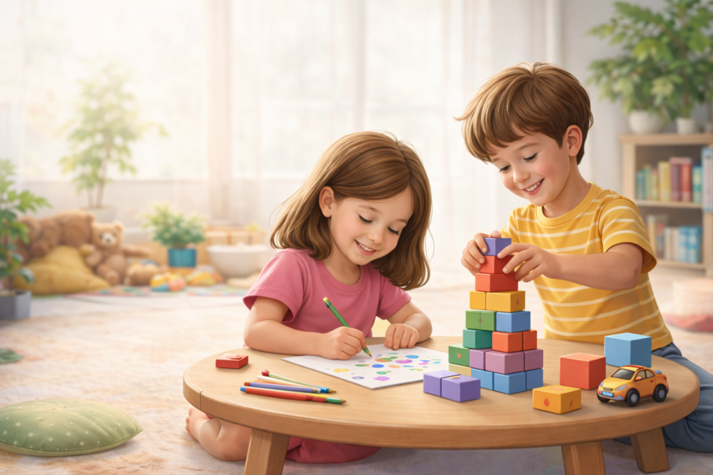În jocul liber (puzzle, lego, desen, construit, jocuri de rol), copilul exersează fără să-și dea seama: